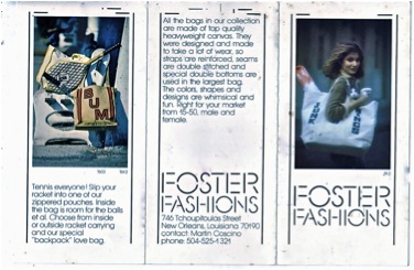 While living in New Oreleans in the early 70’s, she was credited with having been the first designer (for Foster Fashions) to bring the oversized canvas tote with messages printed on them into the public eye, starting a huge trend. It was later adopted by the Bloomingdales Department Store chain known as the Big Bag, as the store’s shopping bag. Warner Brothers Records even packaged one of Al Jarreau’s early albums in one of Wendy’s canvas bag designs.