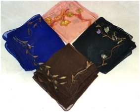 ScarvesCombining her passion for painting and talent for merchandising, Wendy created her signature scarf line which enjoyed world-wide representation. Her chiffons were custom cut in India available in three sizes, and she handpaints and signs each one herself. The most popular has been the versatile pareo, which can be worn as a shawl, belt, neck piece, or wrap skirt. Each one is a signed work of art.